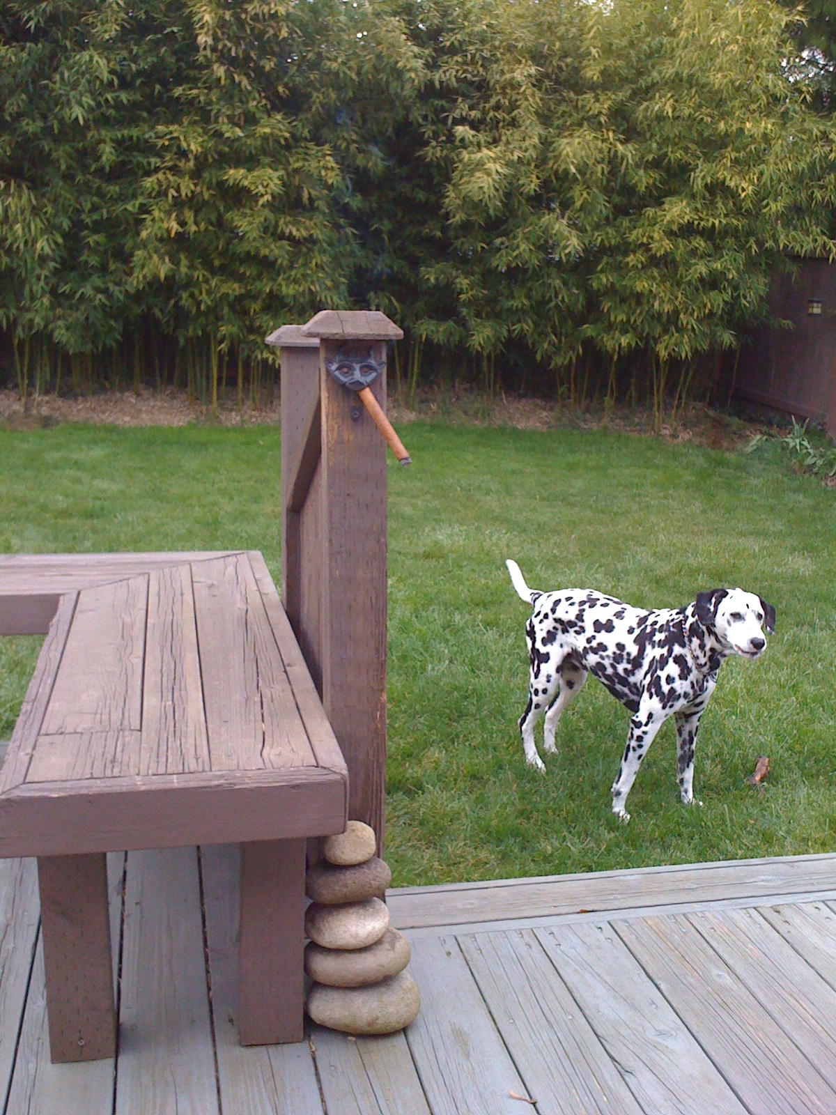 I am not sure whether it was quality time with me, decent weather or the smell of cut grass that Sarrah liked most. While mowing the lawn (after the first few scary experiences with the noisy mower) Sarrah enjoyed being a part of this chore. In the backyard she’d run alongside, and occasionally throw bones or toys in front of the mower to slow me down. She delighted in making me stop to move the obstacle and often then make a high speed pass running by with a huge smile. I would then throw this distraction and she would run to retrieve it. Sarrah would wait for a clump of grass carelessly dropped by the mower to land so she could grab it and trot around, head held high, like a little horse chewing on it. I can see her now, my green-footed little speckle job groaning, rolling and wriggling on her back, getting an aromatic back scratch from the newly cut lawn.