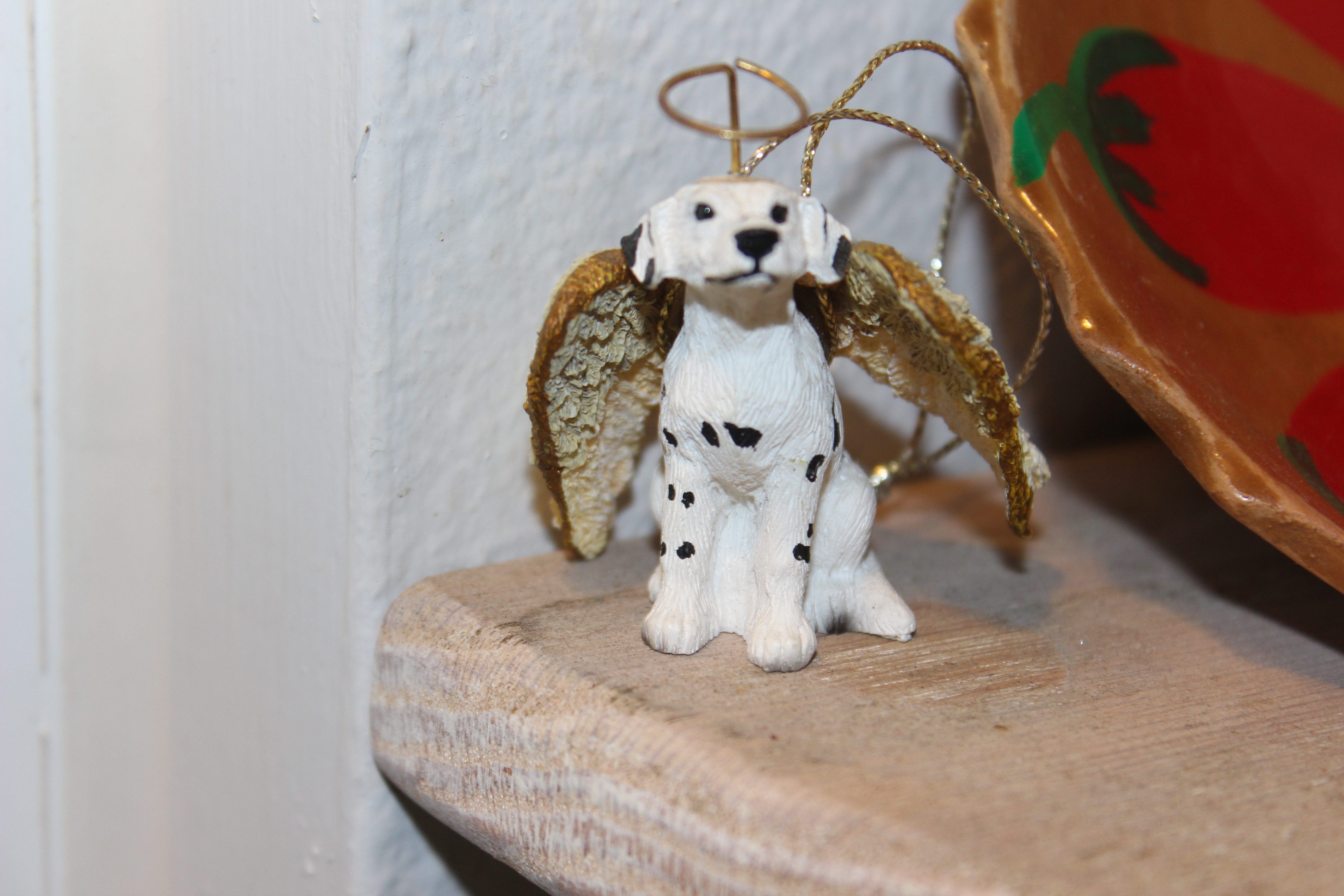 Initially I thought this odd little white dog with black spots, beige and brown wings, a gold wire halo and string to hang it was strange, a dog ornament for a dog.